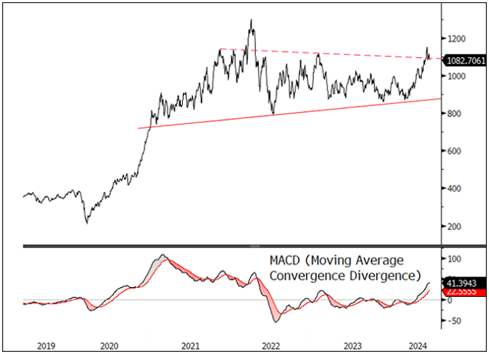 Source: Bloomberg. Nasdaq Sprott Energy Transition Materials Index. Data as of 5/31/2024. Moving average convergence/divergence is a trend-following momentum indicator that shows the relationship between two exponential moving averages (EMAs), calculated by subtracting the 26-period EMA from the 12-period EMA. Included for illustrative purposes only. Past performance is no guarantee of future results.