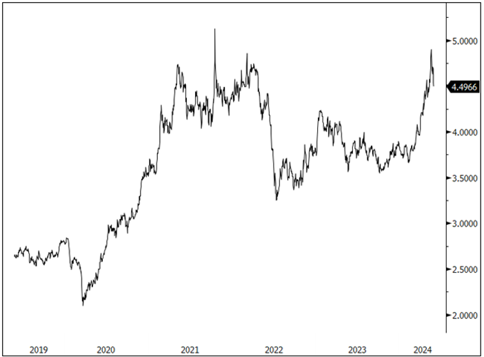 Source: Bloomberg. Copper spot price, $/lb. Data as of 5/31/2024. Included for illustrative purposes only. Past performance is no guarantee of future results.Lithium: Emerging from Unsustainable Lows
