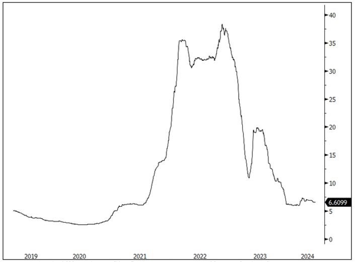 Source: Bloomberg. Lithium carbonate spot price, $/lb. Data as of 5/31/2024. Included for illustrative purposes only. Past performance is no guarantee of future results.