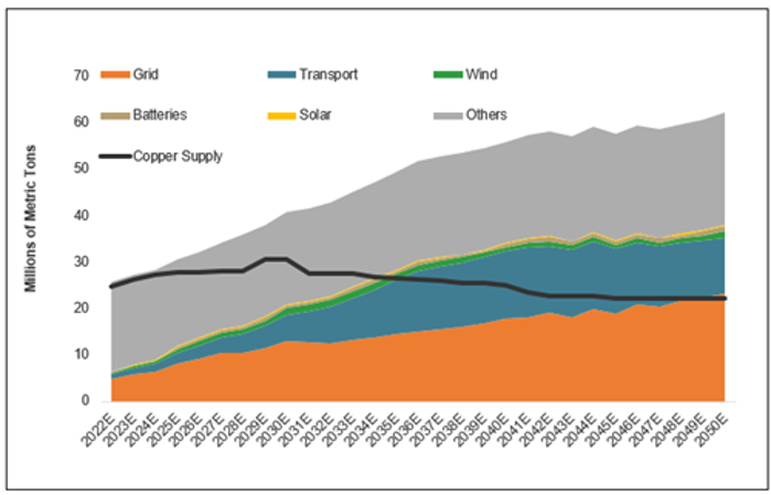 The cumulative demand for copper to 2050 is greater than the total produced copper over the course of human history.