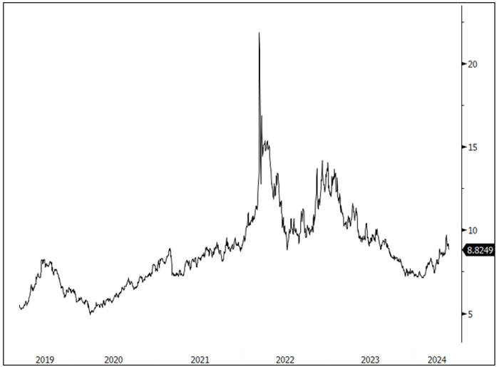 Source: Bloomberg. Nickel spot price, $/lb. Data as of 5/31/2024. Included for illustrative purposes only. Past performance is no guarantee of future results.
