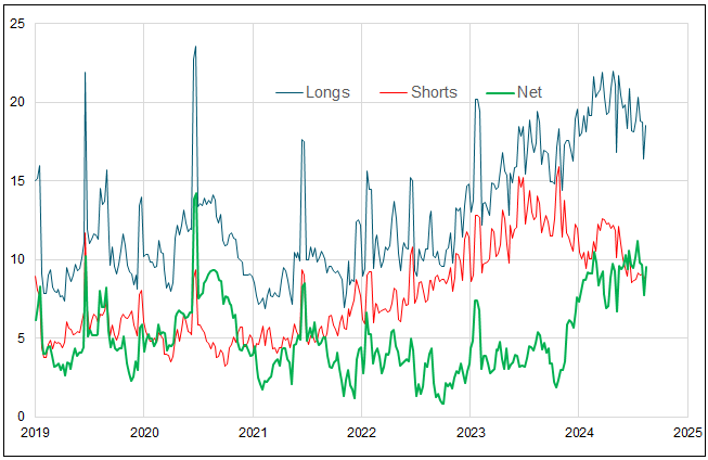 This year, I have noted the call wall plot of gold futures and GLD (SPDR® Gold Shares ETF). Figure 2 highlights the surge in call options with +$2,490 strikes since mid-July. There has been approximately a doubling of notional ounces with a +$2,490 strike from ~4.8 million ounces in mid-July to ~10 million ounces today (thus far). Gold-related calls have also notably rolled up and out (higher strikes and longer-dated = bullish). Last Friday’s (August 16) surge to the $2,500 level was likely due in part to option expiration effects.