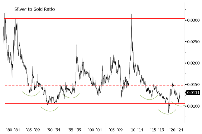 Figure 6b. Silver-to-Gold Ratio and 40-Year-Range Lows (1980-2022)