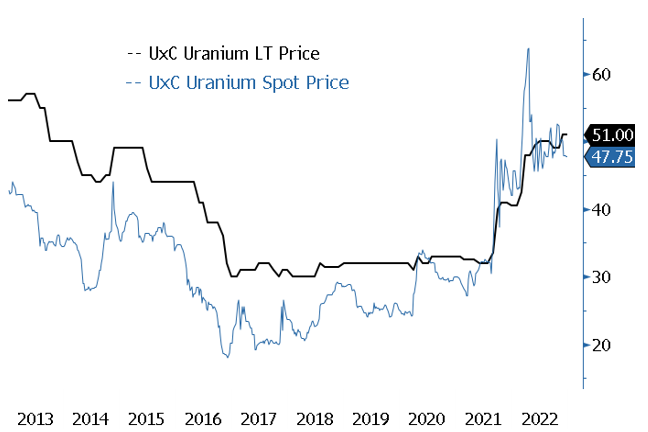 Figure 1. Spot and Long-Term Uranium Prices, Trending Higher (2013-2022)