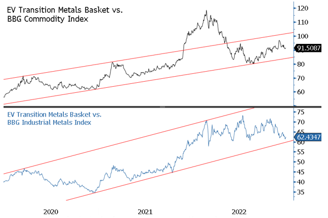 Figure 4. EV Transition Metals versus Bloomberg Commodity and Industrial Metals Indices (2020-2022)