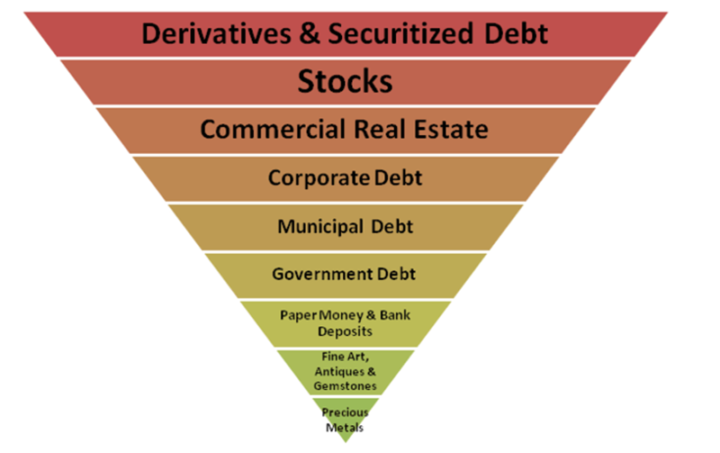 Third, the highly liquid paper gold trade rests on a shaky foundation, best imagined by John Exter, as an inverted pyramid (see Figure 8). Paper gold includes all contracts traded between bullion banks and their clients in the form of swaps, options, futures and other derivatives. According to the LBMA, the daily trading volume of gold in 2024 was 33 million ounces or $80 billion compared to annual gold production of 120,000,000 ounces or $324 billion (2024 prices).
